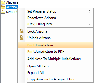 You can also print returns and jurisdictions using the right select menu. Highlight the desired return(s) or jurisdiction(s) in the Active tree, right click, and choose Print Returns or Jurisdictions. The selected returns will print to your default printer based on your Print Options.